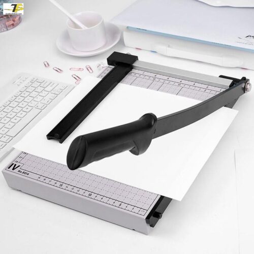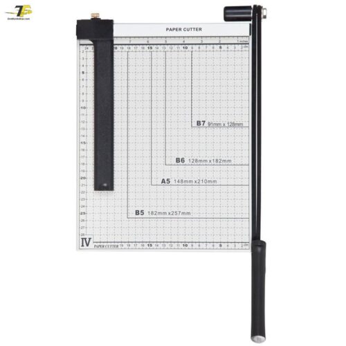 • Hệ thống thước đo & Căn lề chuẩn xác: Mặt bàn in sẵn các khổ giấy thông dụng (A4, A5, B5, B6, B7) cùng thước đo mm/inch rõ ràng, không bị phai mờ theo thời gian. Thanh chặn giấy bằng nhựa (Paper Guide) giúp cố định xấp giấy đúng vị trí, đảm bảo mọi bản cắt đều đồng nhất.
