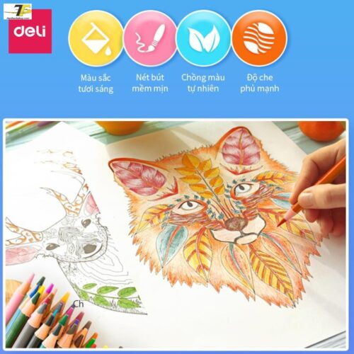 - Chất lượng gốc dầu (Oil-based) vượt trội: Khác với chì sáp thông thường, chì gốc dầu Deli cho độ bám giấy cực tốt, màu sắc rực rỡ và có khả năng kháng nước nhẹ, giúp tranh giữ được độ tươi mới lâu dài.