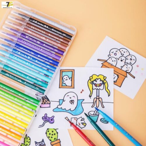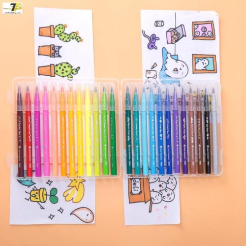 - Hộp nhựa cứng cáp: Sản phẩm được đựng trong hộp nhựa trong suốt có khóa cài, giúp bảo quản bút ngăn nắp, tránh thất lạc và dễ dàng mang theo khi đi học, đi vẽ dã ngoại.